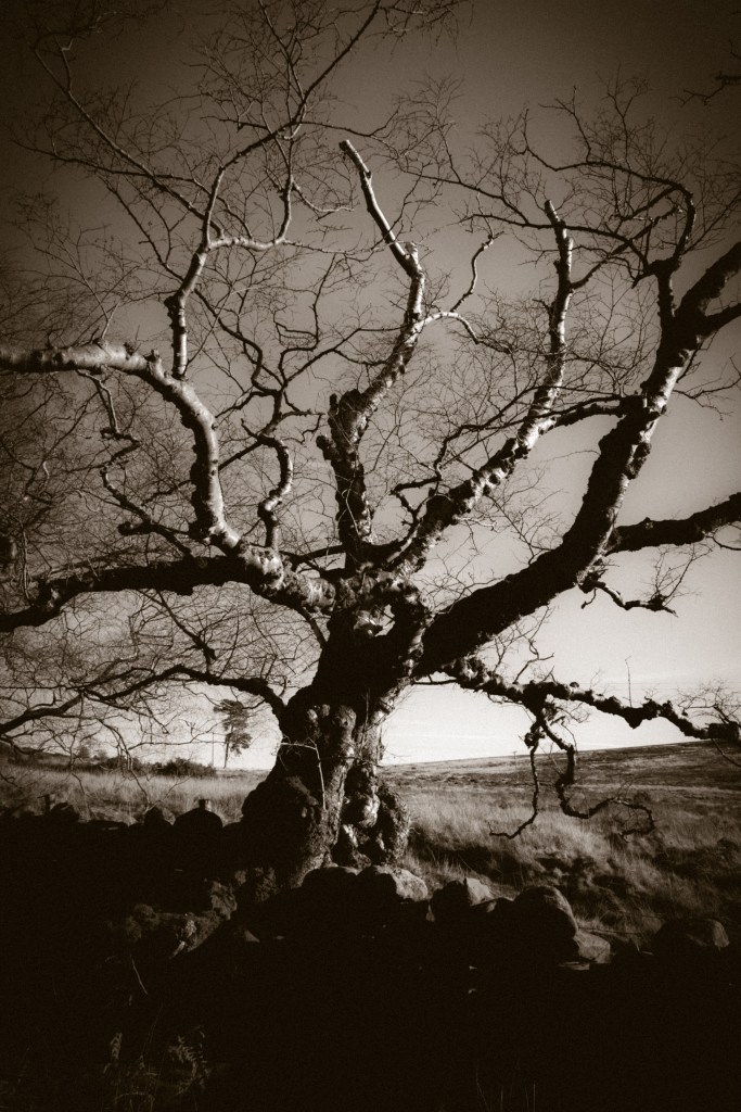 I had several hours before I needed to be back at the train station, so took my time walking and photographing stone walls and trees which had definitely felt the hands of a few witches. From Castleton – after a brief stop at The Eskdale for a tea and probably the best mince pie I’ve eaten this year – I meandered through a silver birch woodland, photographing bark and witch’s broom, then over a mile or so of moorland and up into the village of Danby to fuel up at the excellent bakery there…which was closed.